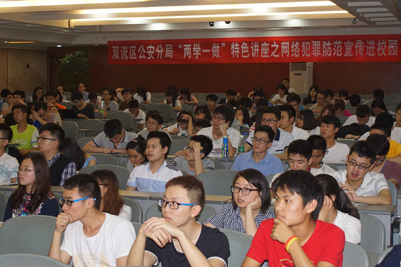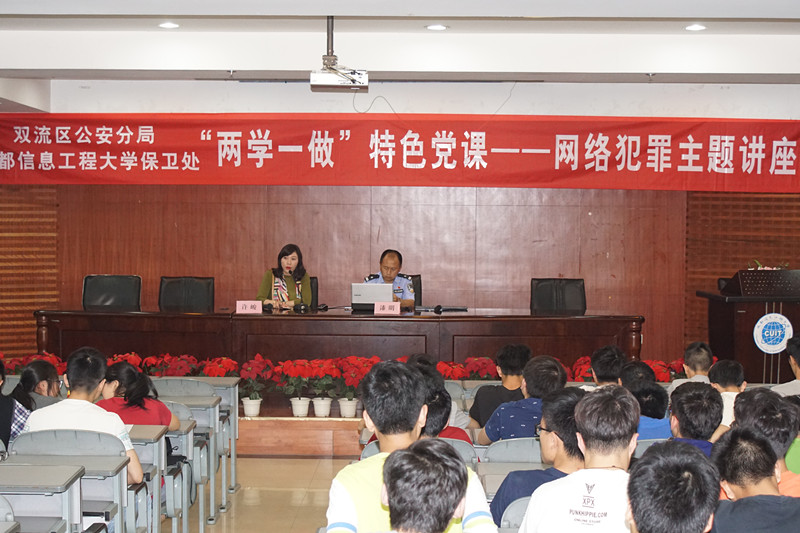 按照我校深入开展“两学一做”提出的明确要求,结合近期网络犯罪案件高发,甚至有部分大学生参与到网络犯罪活动中的实际情况,学校保卫处与成都市公安局网监大队、双流区公安分局联手为计算机学院、信息安全学院近200名学生作了一场别开生面的特色党课——网络犯罪主题讲座。