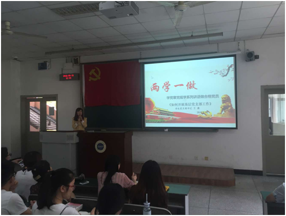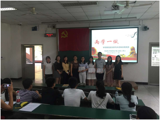 王燕结合“两学一做”指导方针,从指导思想、工作重点目标、主要工作内容三个方面讲解了如何开展基层党支部工作,并强调“党要管党,从严治党”的理念。以基层党支部活动为例,讲解党支部活动开展的重点要围绕党的先进性、保障党支部作用的持续发挥、符合党员身份需要、与实践紧密结合。王燕从自身出发,讲解如何做好基层党支部书记,并强调资环党支部的精神“团结、协作、力争”。