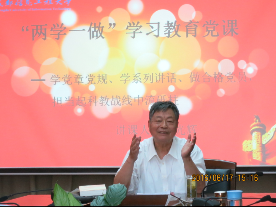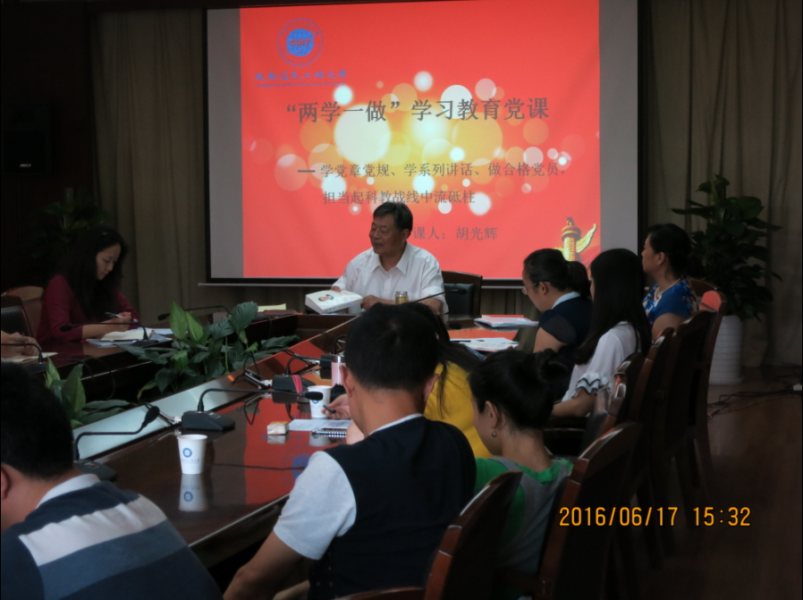 为认真学习贯彻党中央“学党章党规、学系列讲话,做合格党员”教育要求,根据学校“两学一做”办公室安排,6月17日下午,学校退休教师胡光辉在航空港校区为青年教师党员作“两学一做”专题党课,离退休党总支书记赵丽华主持。