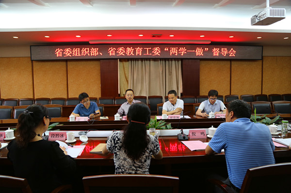 5月30日下午,全省“两学一做”学习教育协调小组督导三组组长、省委组织部党员教育中心主任莫怀学一行四人来我校督查指导“两学一做”学习教育工作。督导组在行政楼第七会议室听取了汇报,学校党委副书记敬枫蓉,党委副书记、纪委书记倪鸣,党政办公室、组织部、宣传部、纪委办公室主要负责人和学校“两学一做”领导小组办公室成员参加了汇报会。